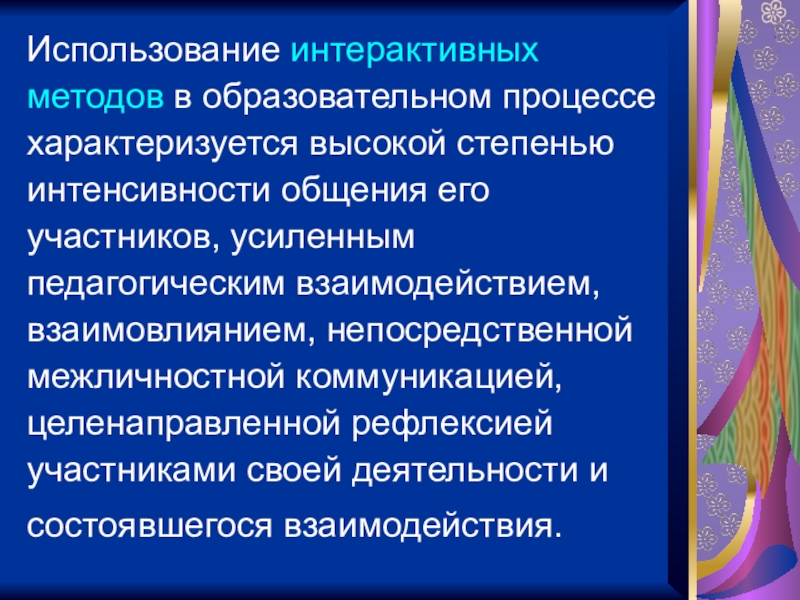 Слайд 26Использование интерактивных методов в образовательном процессе характеризуется высокой степенью интенсивности общения