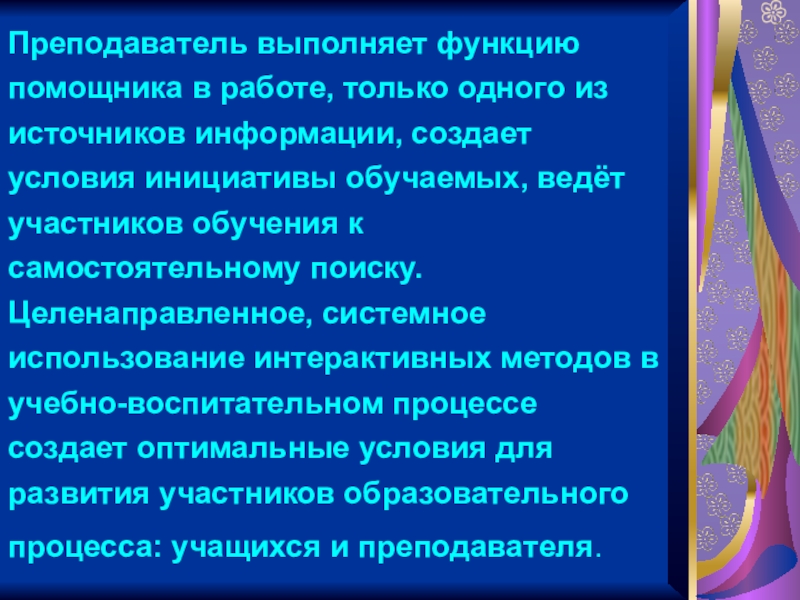 создает условия инициативы обучаемых, ведёт участников обучения к самостоятельному поиску. Целенаправленное, системное использование интерактивных методов в учебно-воспитательном процессе создает оптимальные условия для развития участников образовательного процесса: учащихся и преподавателя.