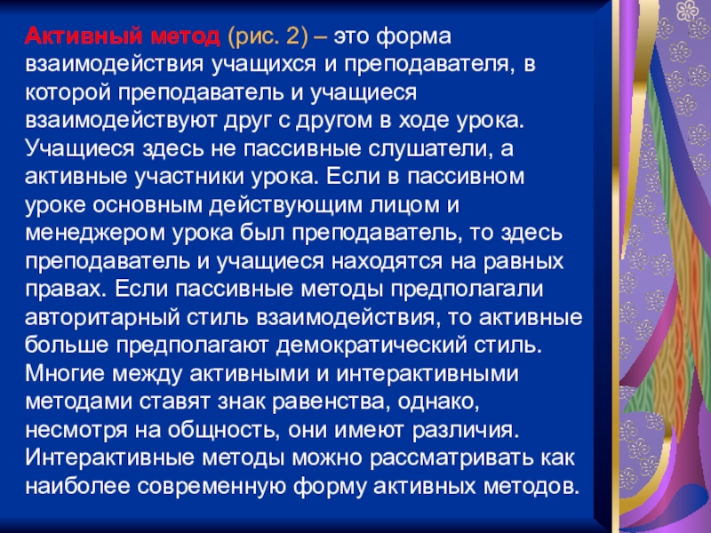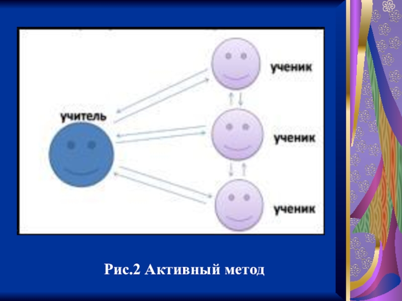 Слайд 7Активный метод (рис. 2) – это форма взаимодействия учащихся и преподавателя, в