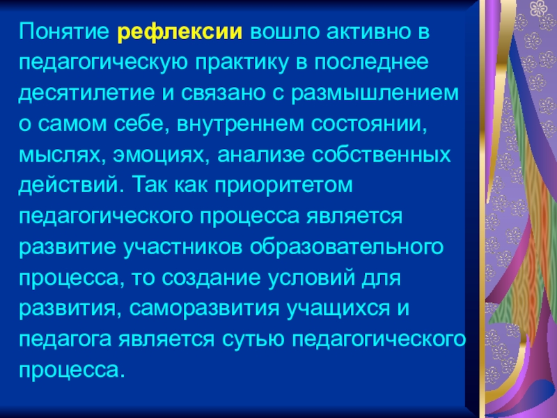Слайд 43Понятие рефлексии вошло активно в педагогическую практику в последнее десятилетие и