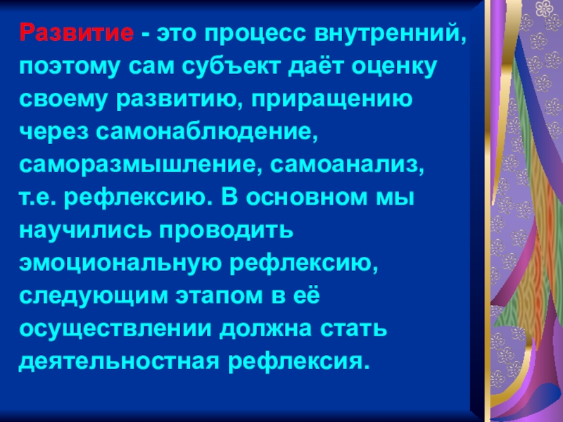 Слайд 44Развитие - это процесс внутренний, поэтому сам субъект даёт оценку своему