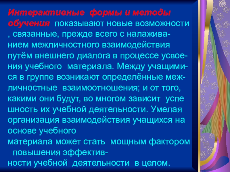 путём внешнего диалога в процессе усвое-ния учебного материала. Между учащими-ся в группе возникают определённые меж-личностные взаимоотношения; и от того, какими они будут, во многом зависит успешность их учебной деятельности. Умелая организация взаимодействия учащихся на основе учебного материала может стать мощным фактором повышения эффектив-ности учебной деятельности в целом.