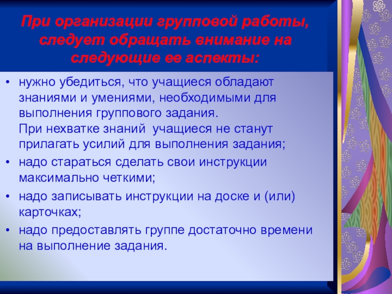 Слайд 18При организации групповой работы, следует обращать внимание на следующие ее аспекты: