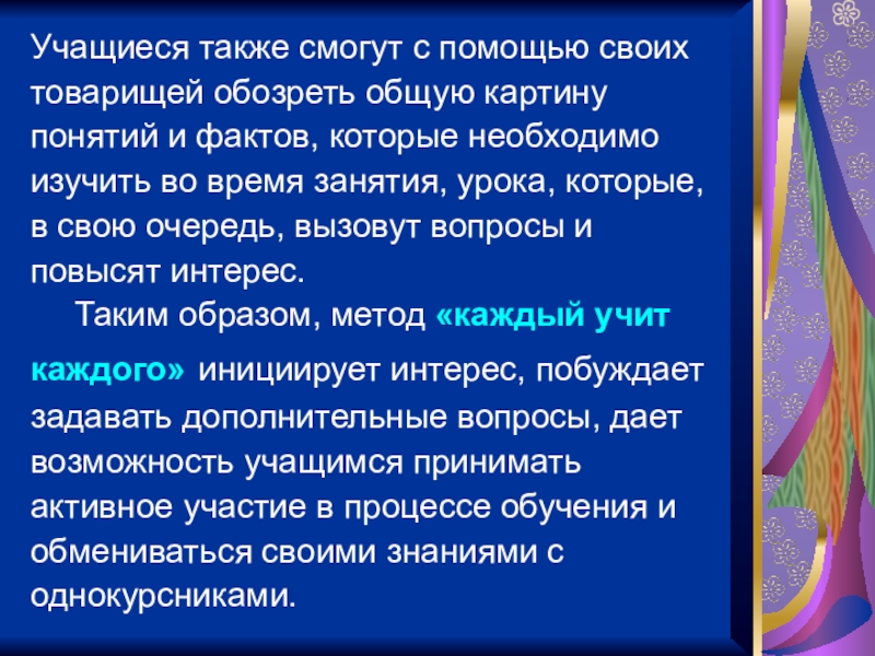 и фактов, которые необходимо изучить во время занятия, урока, которые, в свою очередь, вызовут вопросы и повысят интерес. Таким образом, метод «каждый учит каждого» инициирует интерес, побуждает задавать дополнительные вопросы, дает возможность учащимся принимать активное участие в процессе обучения и обмениваться своими знаниями с однокурсниками.