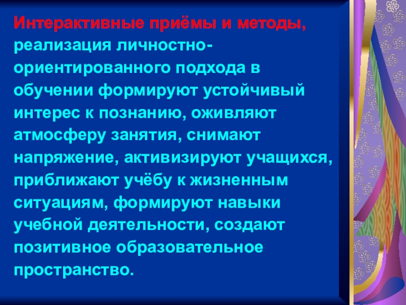 Слайд 45Интерактивные приёмы и методы, реализация личностно-ориентированного подхода в обучении формируют устойчивый