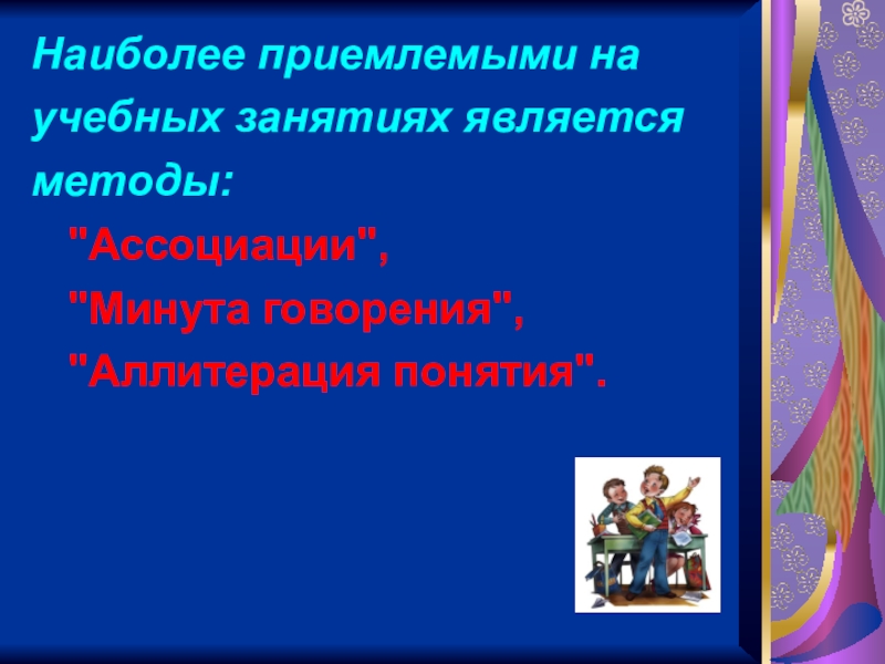 Слайд 41Наиболее приемлемыми на учебных занятиях является методы: