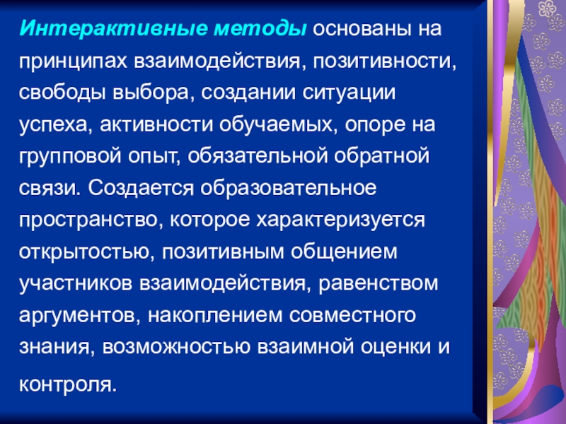 Слайд 27Интерактивные методы основаны на принципах взаимодействия, позитивности, свободы выбора, создании ситуации