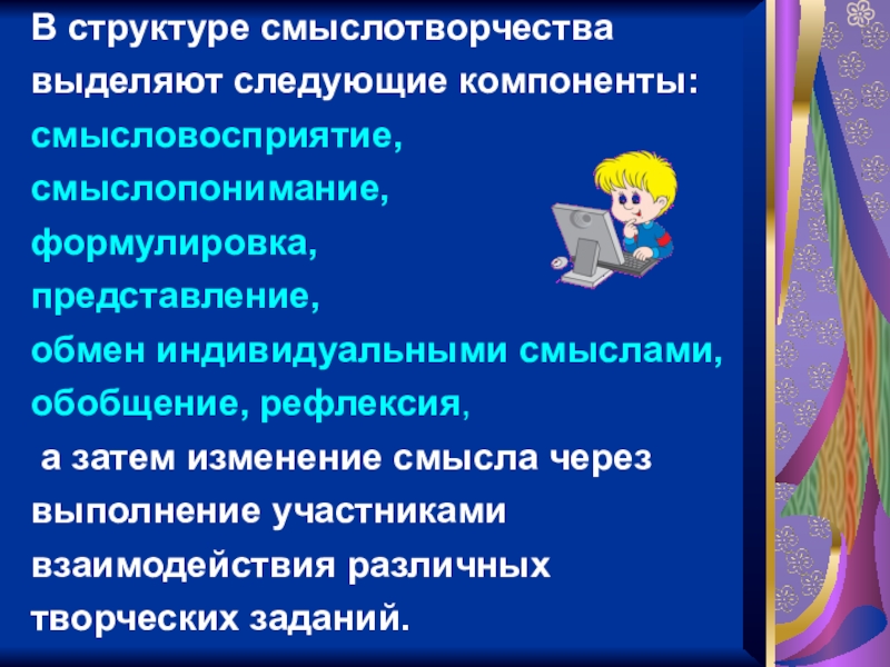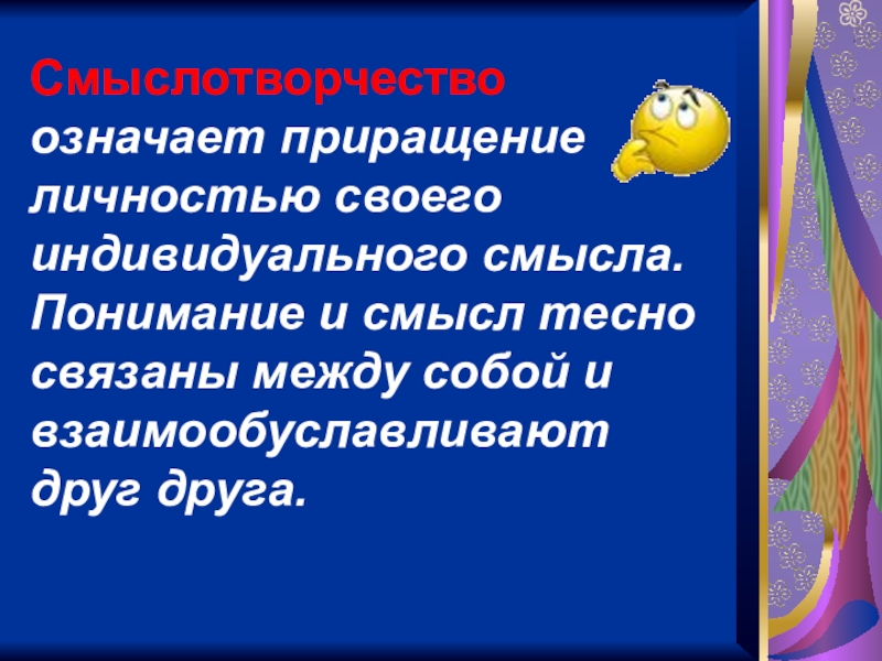 Слайд 40В структуре смыслотворчества выделяют следующие компоненты: смысловосприятие, смыслопонимание,