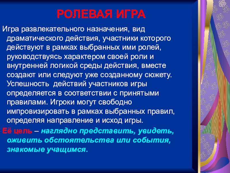 рамках выбранных ими ролей, руководствуясь характером своей роли и внутренней логикой среды действия, вместе создают или следуют уже созданному сюжету. Успешность действий участников игры определяется в соответствии с принятыми правилами. Игроки могут свободно импровизировать в рамках выбранных правил, определяя направление и исход игры.