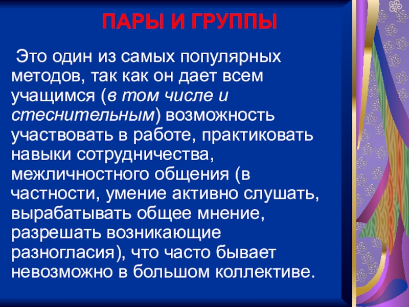 дает всем учащимся (в том числе и стеснительным) возможность участвовать в работе, практиковать навыки сотрудничества, межличностного общения (в частности, умение активно слушать, вырабатывать общее мнение, разрешать возникающие разногласия), что часто бывает невозможно в большом коллективе.