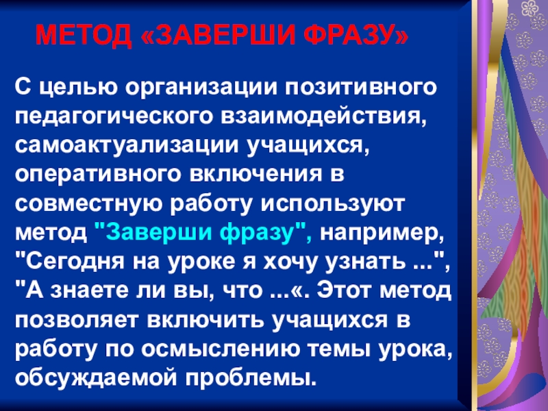 включения в совместную работу используют метод "Заверши фразу", например, "Сегодня на уроке я хочу узнать ...", "А знаете ли вы, что ...«. Этот метод позволяет включить учащихся в работу по осмыслению темы урока, обсуждаемой проблемы.