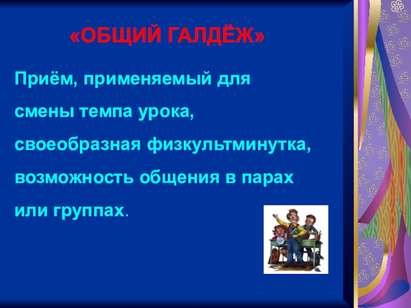 Приём, применяемый для смены темпа урока, своеобразная физкультминутка, возможность общения