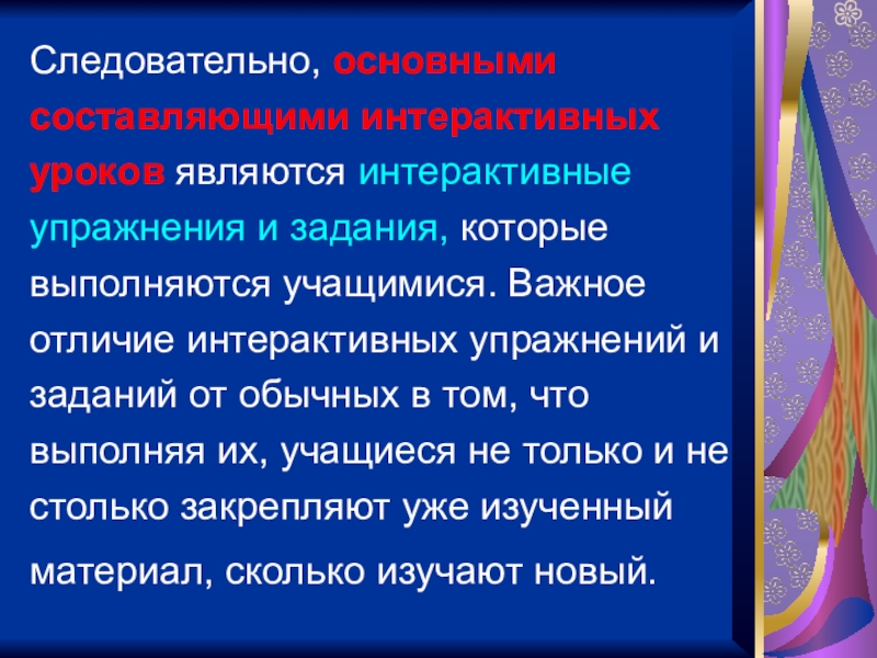Слайд 11Следовательно, основными составляющими интерактивных уроков являются интерактивные упражнения и задания, которые