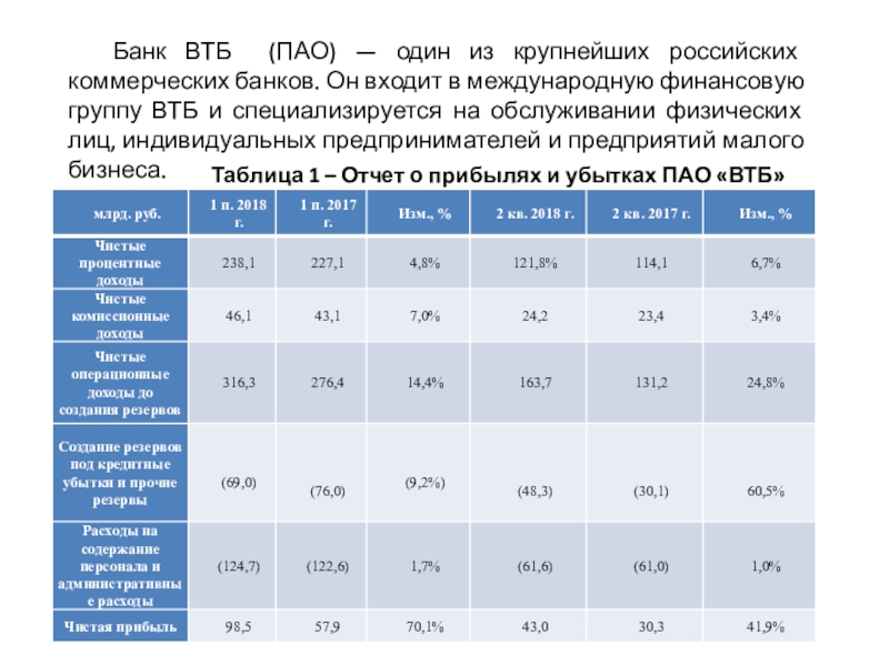Таблица 1 – Отчет о прибылях и убытках ПАО «ВТБ»