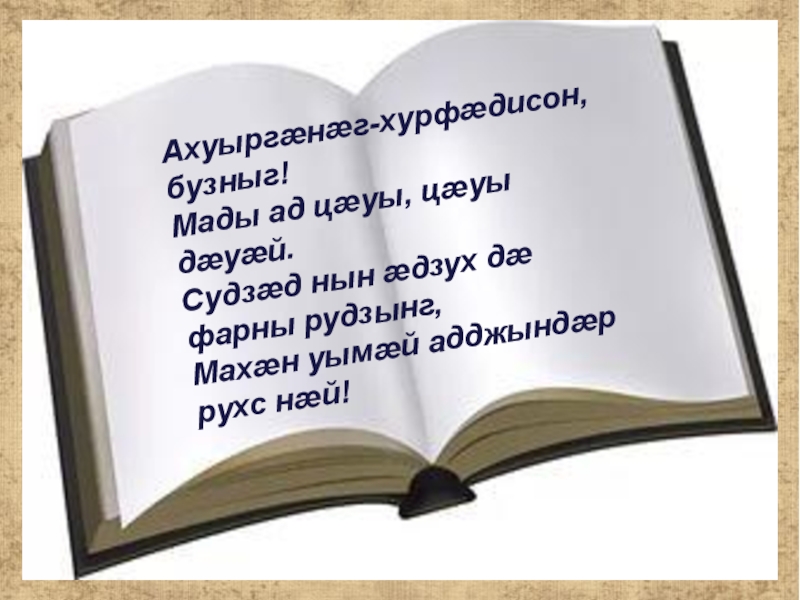 Ахуыргӕнӕг-хурфӕдисон, бузныг!Мады ад цӕуы, цӕуы дӕуӕй.Судзӕд нын ӕдзух дӕ фарны рудзынг,Махӕн уымӕй адджындӕр рухс нӕй!
