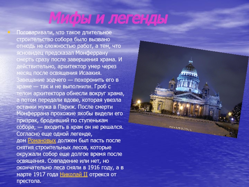 собора было вызвано отнюдь не сложностью работ, а тем, что ясновидец предсказал Монферрану смерть сразу после завершения храма. И действительно, архитектор умер через месяц после освящения Исаакия. Завещание зодчего — похоронить его в храме — так и не выполнили. Гроб с телом архитектора обнесли вокруг храма, а потом передали вдове, которая увезла останки мужа в Париж. После смерти Монферрана прохожие якобы видели его призрак, бродивший по ступенькам собора, — входить в храм он не решался. Согласно еще одной легенде, дом Романовых должен был пасть после снятия строительных лесов, которые окружали собор еще долгое время после освящения. Совпадение или нет, но окончательно леса сняли в 1916 году, а в марте 1917 года Николай II отрекся от престола.
