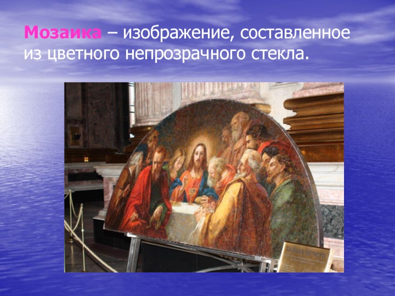Слайд 15Мозаика – изображение, составленное из цветного непрозрачного стекла.