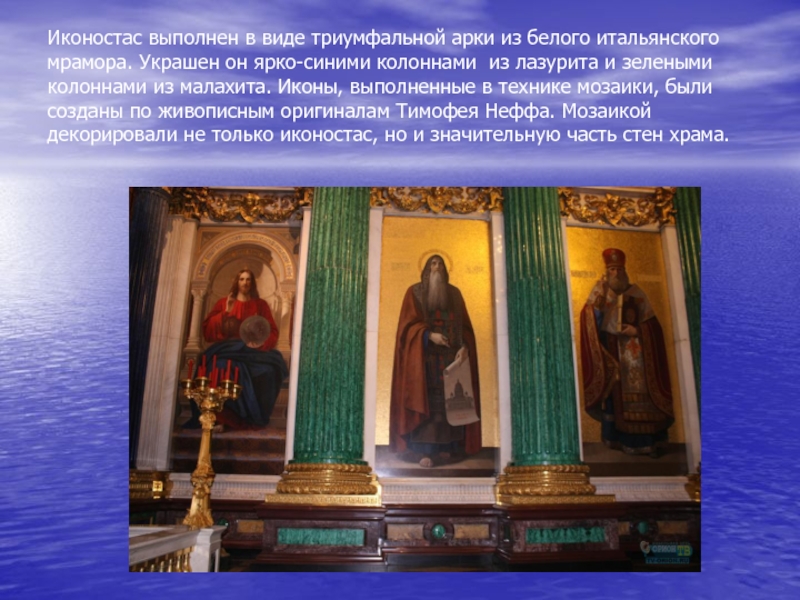 он ярко-синими колоннами из лазурита и зелеными колоннами из малахита. Иконы, выполненные в технике мозаики, были созданы по живописным оригиналам Тимофея Неффа. Мозаикой декорировали не только иконостас, но и значительную часть стен храма.