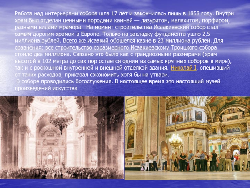 1858 году. Внутри храм был отделан ценными породами камней — лазуритом, малахитом, порфиром, разными видами мрамора. На момент строительства Исаакиевский собор стал самым дорогим храмом в Европе. Только на закладку фундамента ушло 2,5 миллиона рублей. Всего же Исаакий обошелся казне в 23 миллиона рублей. Для сравнения: все строительство соразмерного Исаакиевскому Троицкого собора стоило два миллиона. Связано это было как с грандиозными размерами (храм высотой в 102 метра до сих пор остается одним из самых крупных соборов в мире), так и с роскошной внутренней и внешней отделкой здания. Николай I, опешивший от таких расходов, приказал сэкономить хотя бы на утвари.