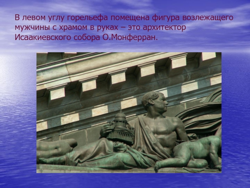 Слайд 10В левом углу горельефа помещена фигура возлежащего мужчины с храмом в