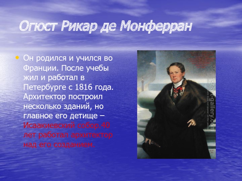 учебы жил и работал в Петербурге с 1816 года. Архитектор построил несколько зданий, но главное его детище – Исаакиевский собор.40 лет работал архитектор над его созданием.