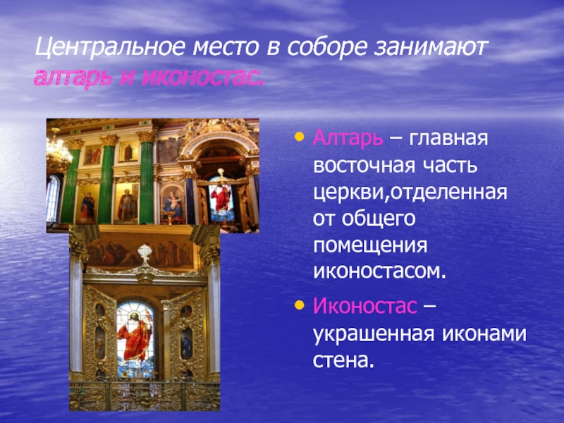 Слайд 12Центральное место в соборе занимают алтарь и иконостас.