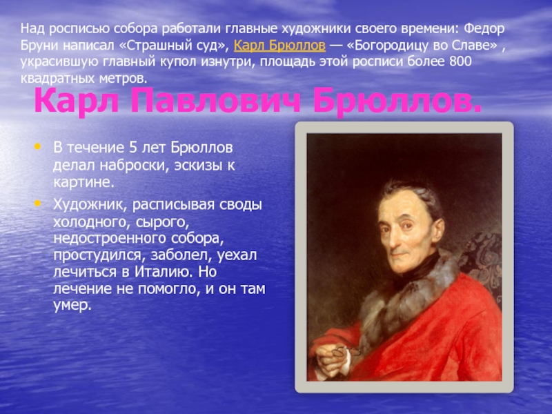 Над росписью собора работали главные художники своего времени: Федор Бруни написал «Страшный суд», Карл Брюллов — «Богородицу во Славе» , украсившую главный купол изнутри, площадь этой росписи более 800 квадратных метров.