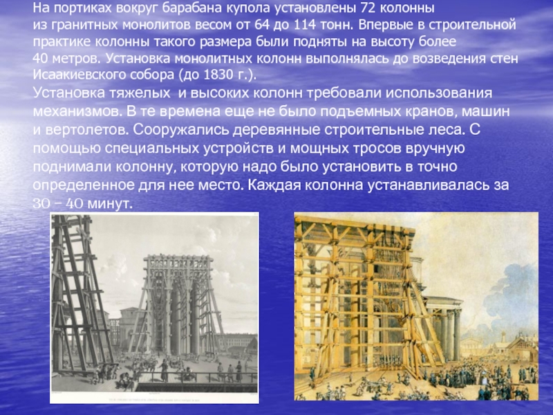 64 до 114 тонн. Впервые в строительной практике колонны такого размера были подняты на высоту более 40 метров. Установка монолитных колонн выполнялась до возведения стен Исаакиевского собора (до 1830 г.).