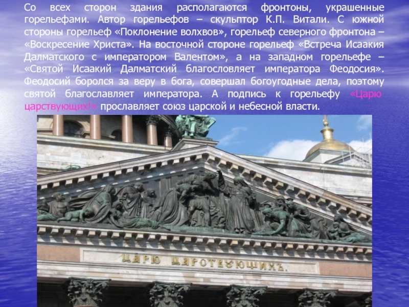 скульптор К.П. Витали. С южной стороны горельеф «Поклонение волхвов», горельеф северного фронтона – «Воскресение Христа». На восточной стороне горельеф «Встреча Исаакия Далматского с императором Валентом», а на западном горельефе – «Святой Исаакий Далматский благословляет императора Феодосия». Феодосий боролся за веру в бога, совершал богоугодные дела, поэтому святой благославляет императора. А подпись к горельефу «Царю царствующих!» прославляет союз царской и небесной власти.