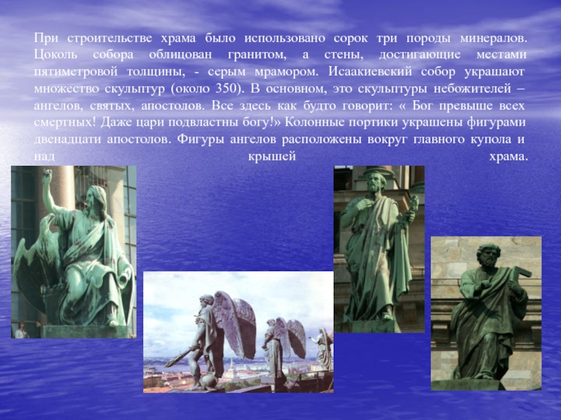 облицован гранитом, а стены, достигающие местами пятиметровой толщины, - серым мрамором. Исаакиевский собор украшают множество скульптур (около 350). В основном, это скульптуры небожителей – ангелов, святых, апостолов. Все здесь как будто говорит: « Бог превыше всех смертных! Даже цари подвластны богу!» Колонные портики украшены фигурами двенадцати апостолов. Фигуры ангелов расположены вокруг главного купола и над крышей храма.