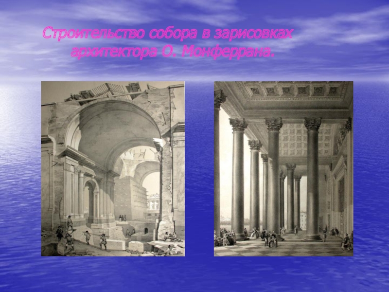 на этой площади. Первую деревянную церковь в честь святого Исаакия Далматского возвели для рабочих Адмиралтейских верфей практически сразу после основания Санкт-Петербурга. Поставили ее в 1710 г. по повелению Петра 1, который родился в день святого Исаакия, византийского монаха. В 1712 году Петр 1 обвенчался здесь с Екатериной I. Уже в 1717 году, когда старая церковь стала ветшать, было заложено новое каменное здание. Строительство шло под руководством Георга Маттарнови и Николая Гербеля. Через полвека, когда уже вторая петровская церковь пришла в негодность, было заложено третье здание — уже на другом месте, немного дальше от берега Невы, между Исаакиевской и Сенатской. Его архитектором стал Антонио Ринальди. После Отечественной войны 1812 года по приказу Александра I начинается проектирование нового храма. Император остановил свой выбор именно на проекте пятиглавого храма в классическом стиле, автором которого был Монферран.