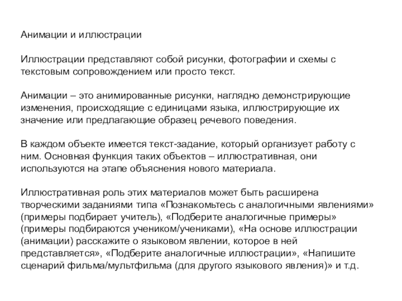 Объекты данного типа выполняют не только демонстрационную функцию, но и служат опорой для анализа языкового и речевого материала, стимулируют высказывания учащихся по изучаемой теме.