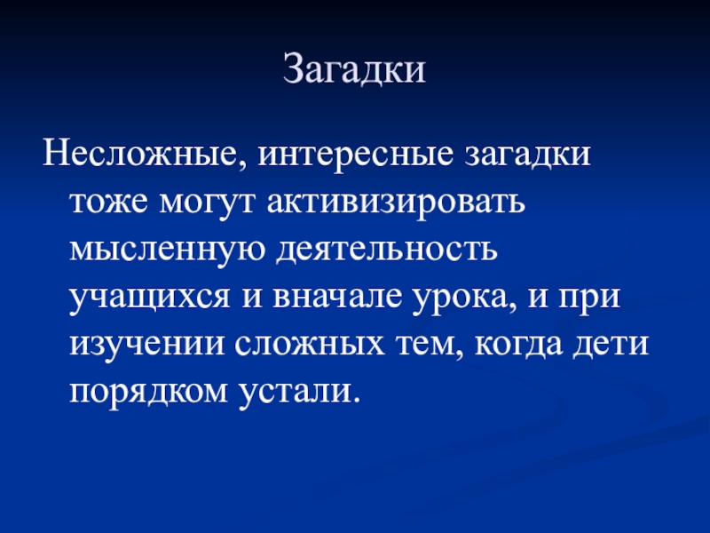 Несложные, интересные загадки тоже могут активизировать мысленную деятельность учащихся и вначале