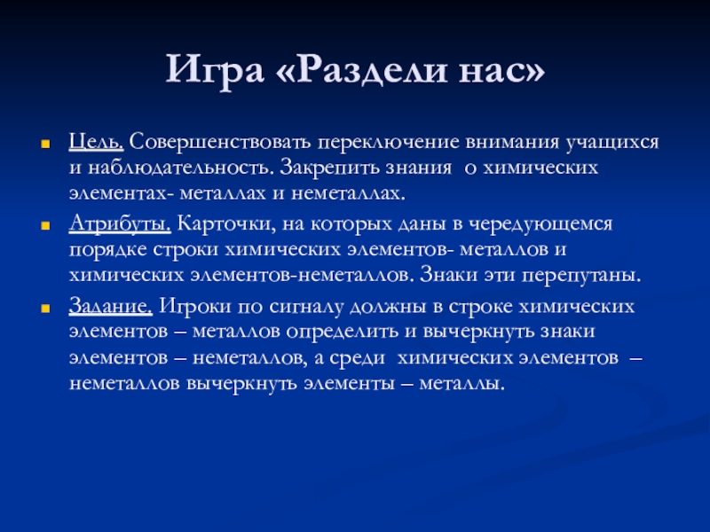 Задание. Игроки по сигналу должны в строке химических элементов – металлов определить и вычеркнуть знаки элементов – неметаллов, а среди химических элементов – неметаллов вычеркнуть элементы – металлы.