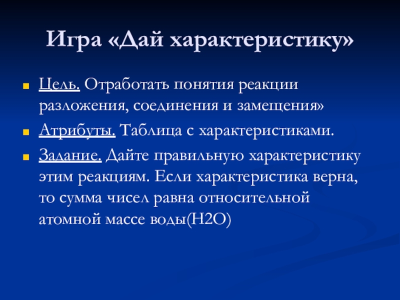 Задание. Дайте правильную характеристику этим реакциям. Если характеристика верна, то сумма чисел равна относительной атомной массе воды(H2O)