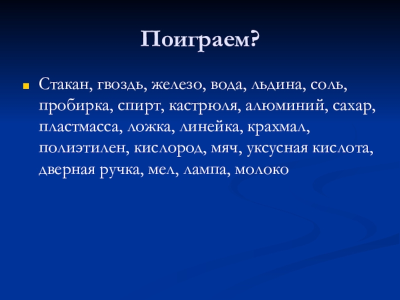 пластмасса, ложка, линейка, крахмал, полиэтилен, кислород, мяч, уксусная кислота, дверная ручка, мел, лампа, молоко