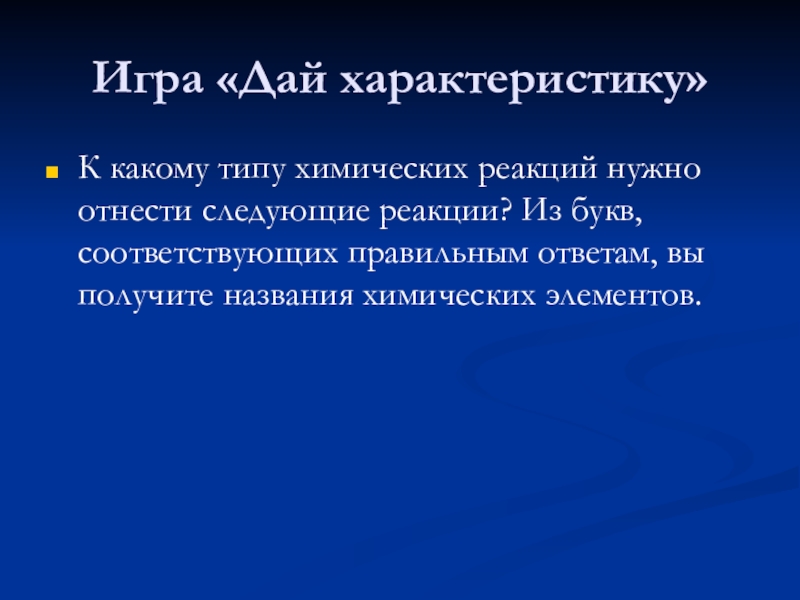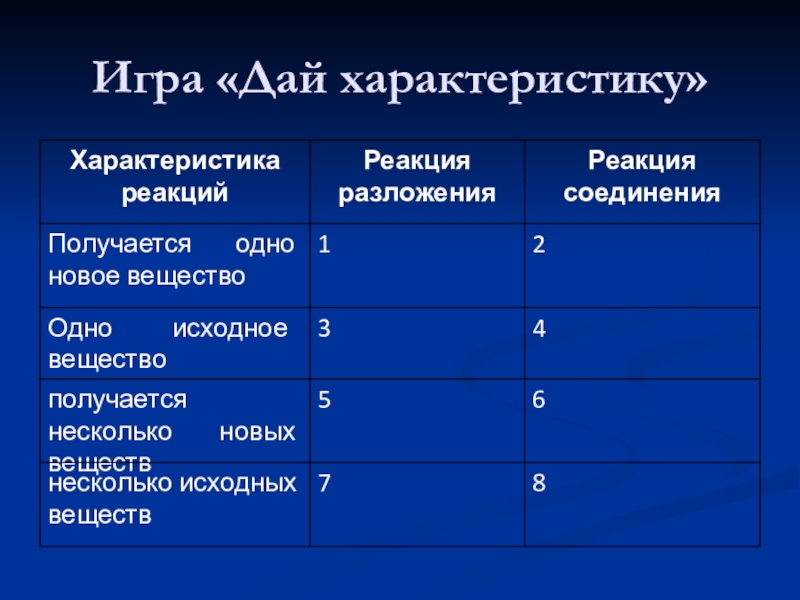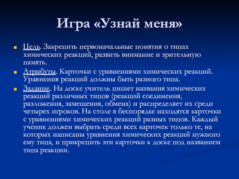 Задание. На доске учитель пишет названия химических реакций различных типов (реакций соединения, разложения, замещения, обмена) и распределяет их среди четырех игроков. На столе в беспорядке находятся карточки с уравнениями химических реакций разных типов. Каждый ученик должен выбрать среди всех карточек только те, на которых написаны уравнения химических реакций нужного ему типа, и прикрепить эти карточки к доске под названием типа реакции.