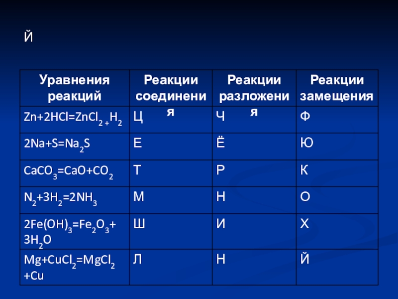 Цель. Отработать понятия реакции разложения, соединения и замещения»