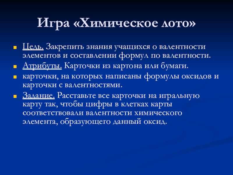 Задание. Расставьте все карточки на игральную карту так, чтобы цифры в клетках карты соответствовали валентности химического элемента, образующего данный оксид.