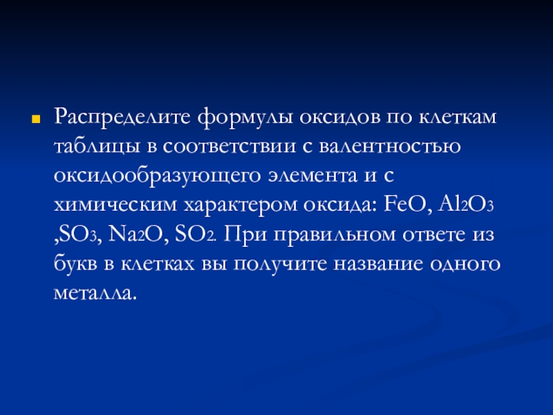 элемента и с химическим характером оксида: FeO, Al2O3 ,SO3, Na2O, SO2. При правильном ответе из букв в клетках вы получите название одного металла.