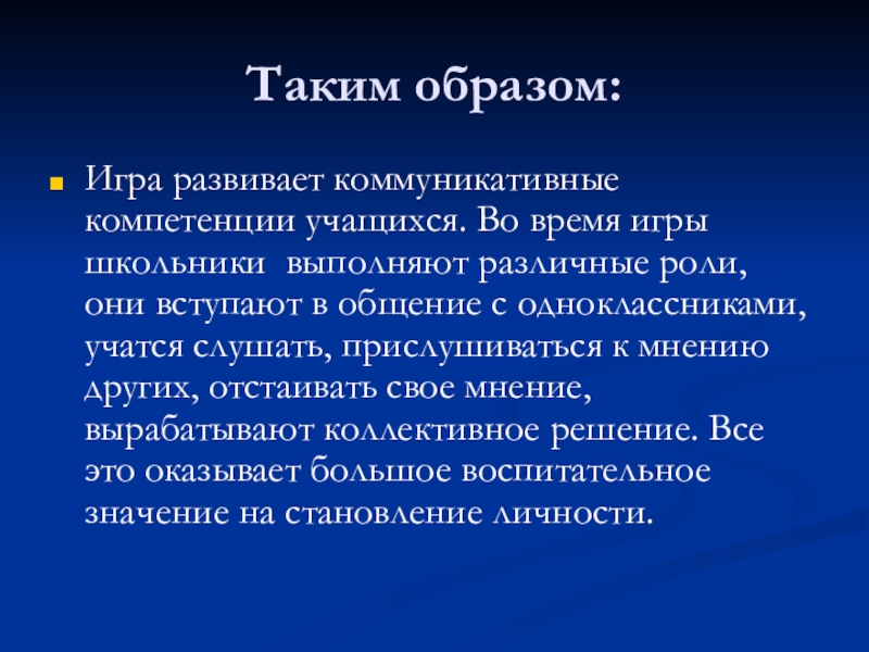 Игра развивает коммуникативные компетенции учащихся. Во время игры школьники выполняют