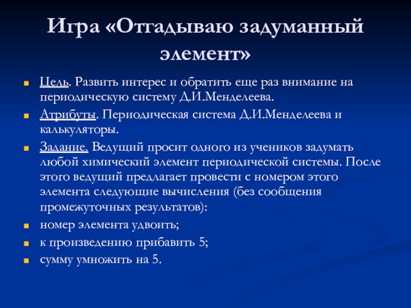 Задание. Ведущий просит одного из учеников задумать любой химический элемент периодической системы. После этого ведущий предлагает провести с номером этого элемента следующие вычисления (без сообщения промежуточных результатов):