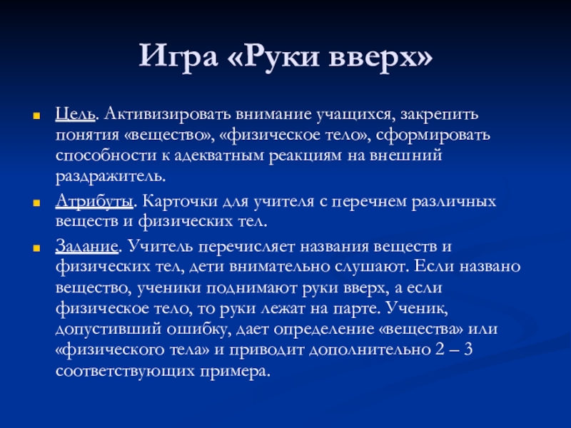 Задание. Учитель перечисляет названия веществ и физических тел, дети внимательно слушают. Если названо вещество, ученики поднимают руки вверх, а если физическое тело, то руки лежат на парте. Ученик, допустивший ошибку, дает определение «вещества» или «физического тела» и приводит дополнительно 2 – 3 соответствующих примера.