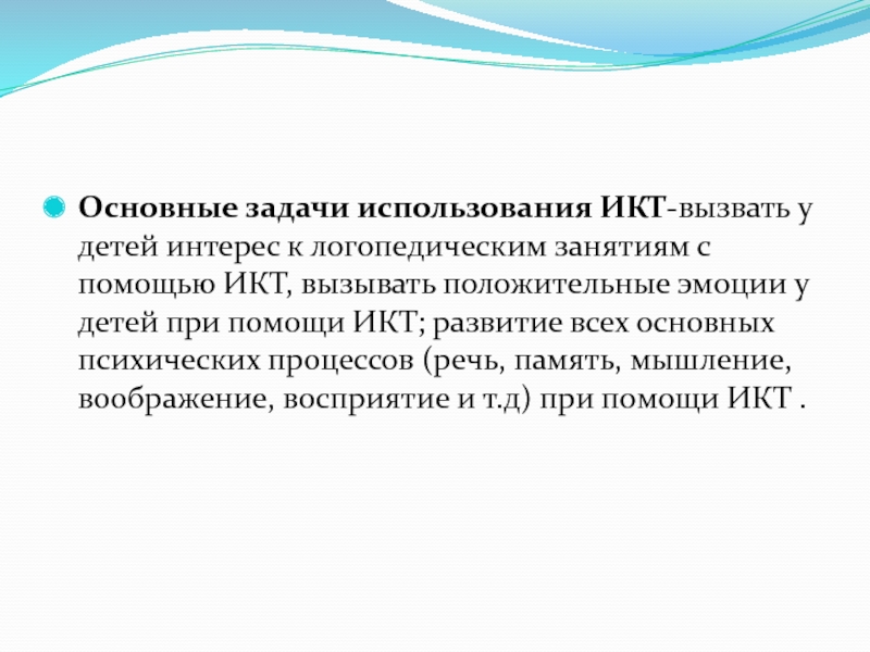 Слайд 3Основные задачи использования ИКТ-вызвать у детей интерес к логопедическим занятиям с