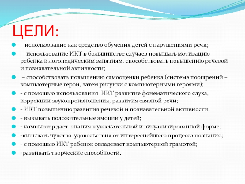 ЦЕЛИ:– использование как средство обучения детей с нарушениями речи; – использование ИКТ в большинстве случаев повышать мотивацию ребенка к логопедическим