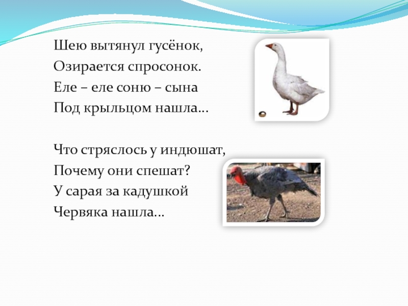 Слайд 7Шею вытянул гусёнок,