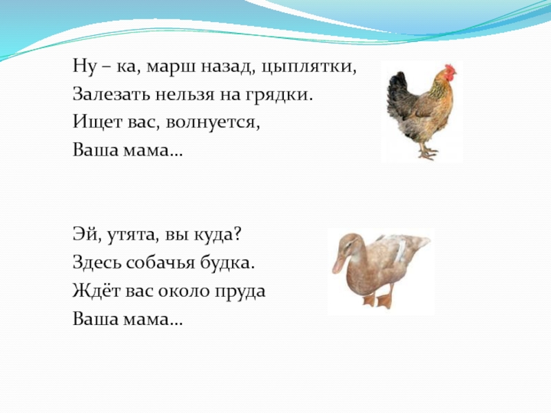 Ну – ка, марш назад, цыплятки,Залезать нельзя на грядки.Ищет вас, волнуется,Ваша мама…Эй, утята, вы куда?Здесь собачья будка.Ждёт