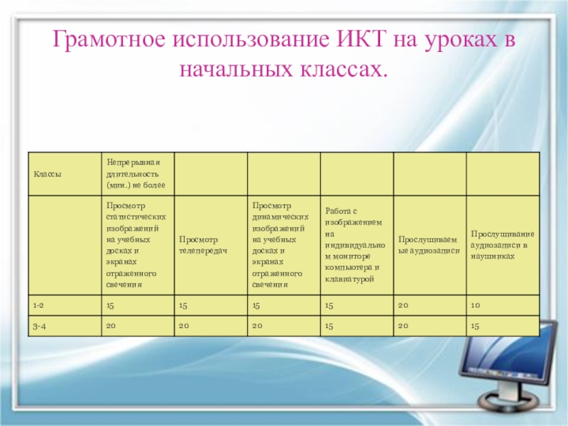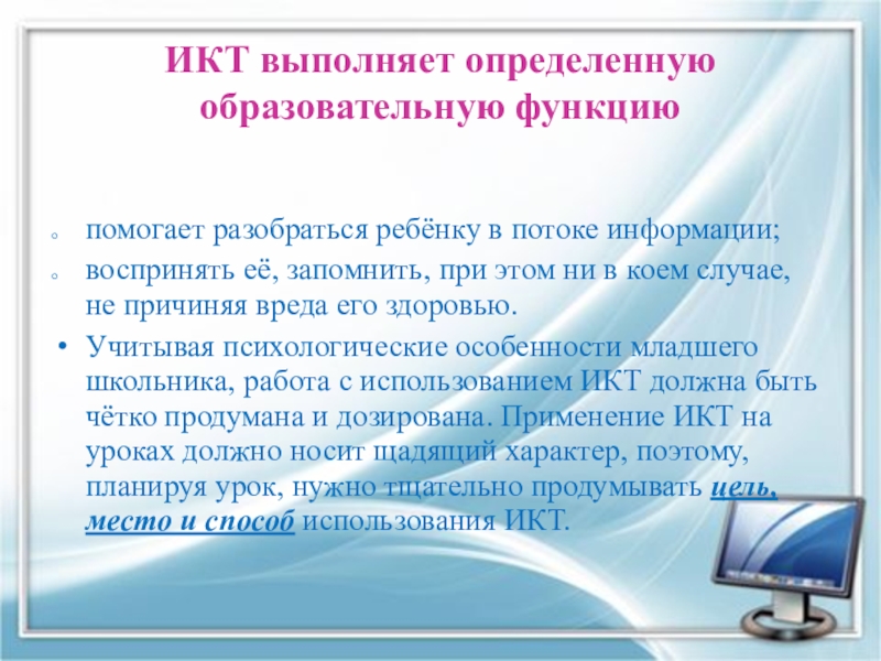 Учитывая психологические особенности младшего школьника, работа с использованием ИКТ должна быть чётко продумана и дозирована. Применение ИКТ на уроках должно носит щадящий характер, поэтому, планируя урок, нужно тщательно продумывать цель, место и способ использования ИКТ.