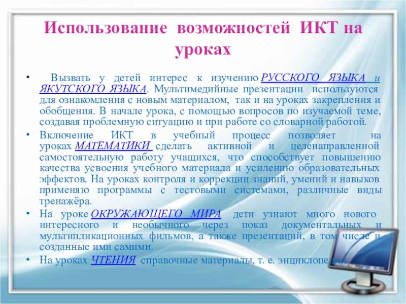 ЯЗЫКА и ЯКУТСКОГО ЯЗЫКА. Мультимедийные презентации используются для ознакомления с новым материалом, так и на уроках закрепления и обобщения. В начале урока, с помощью вопросов по изучаемой теме, создавая проблемную ситуацию и при работе со словарной работой.