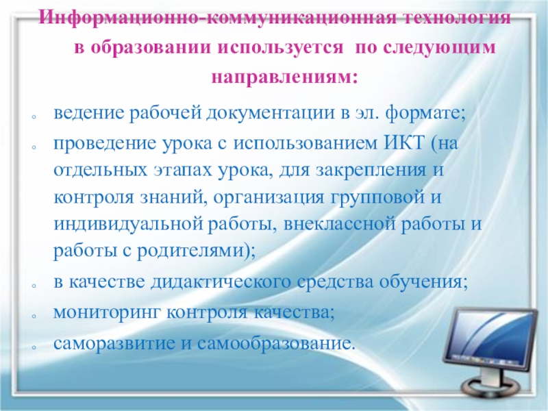 Слайд 6Информационно-коммуникационная технология в образовании используется по следующим направлениям: